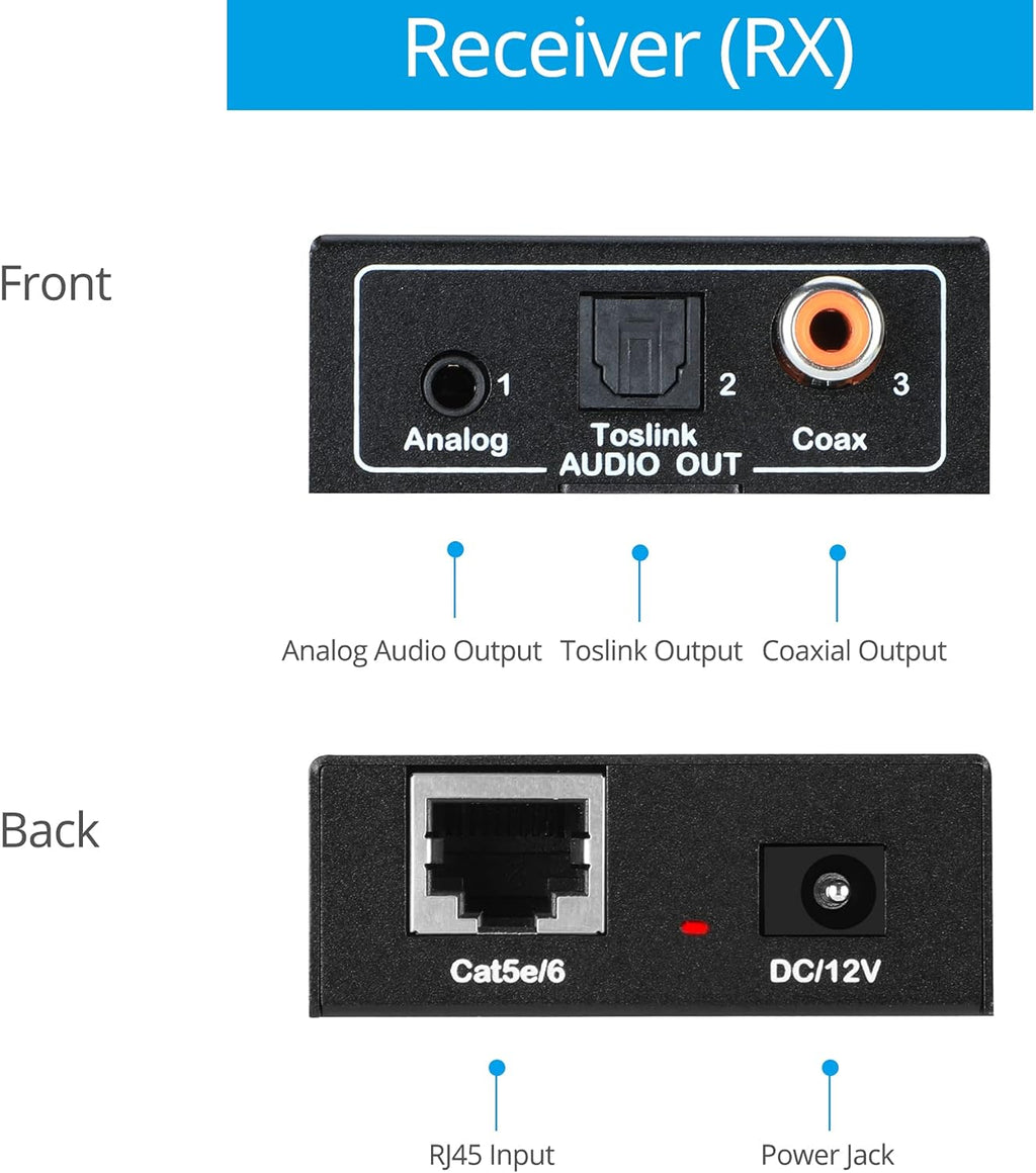 SimplyASP Tech Audio Extender Over CAT5e /6/7 - Coaxial/Toslink/Analog Audio, 984 ft Extension, Bi-Directional PoC, Up to 5.1-Channel, Supports Analog Stereo and Digital Audio