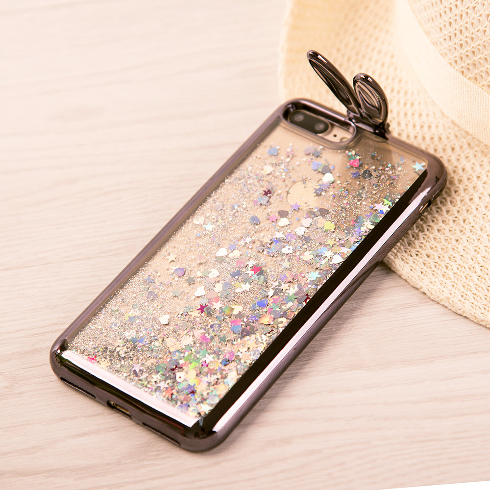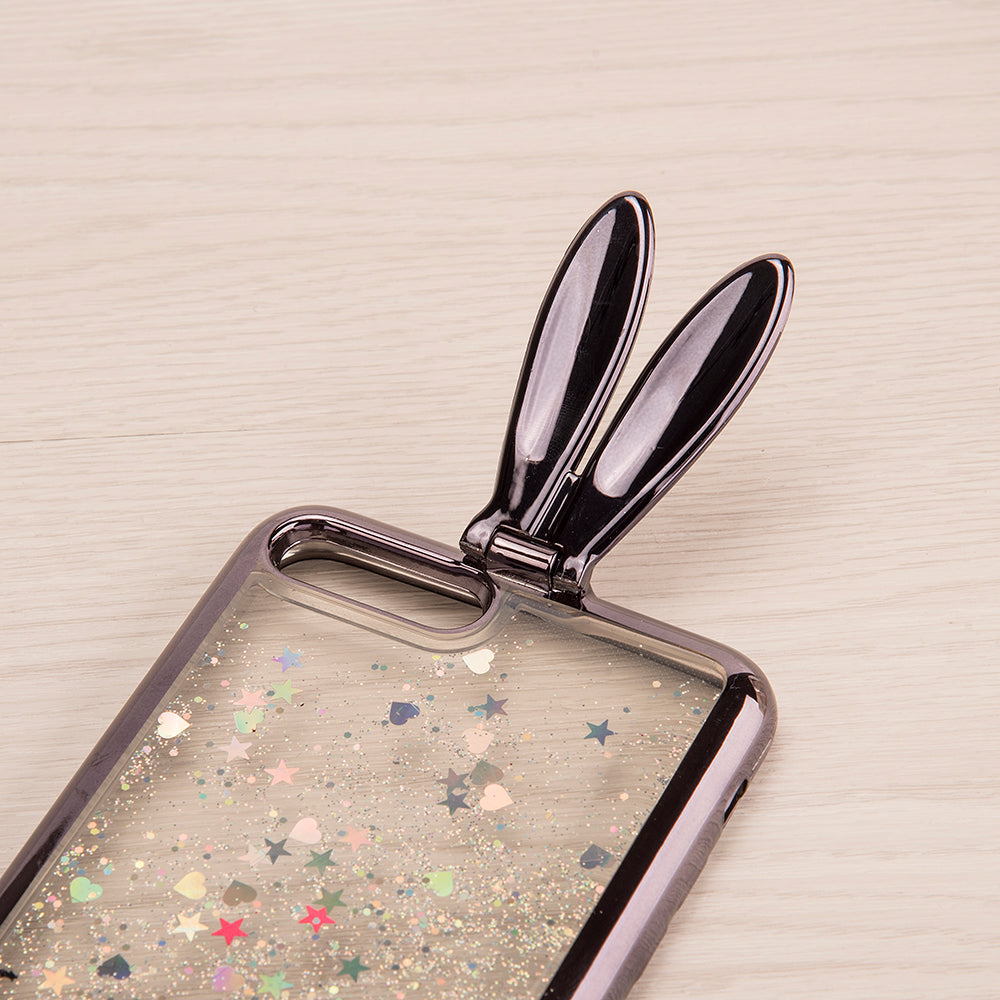 IPHONE 7 PLUS BUNNY LIQUID SPARKLING QUICKSAND TPU CASE WITH EAR STAND - BLACK